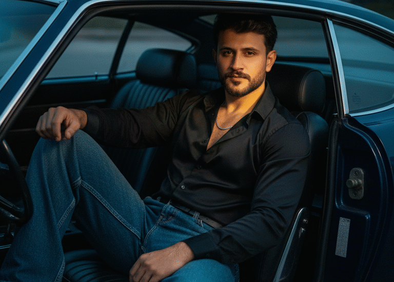 Shot on a Hasselblad X2D 100C with a 90mm f/2.5 lens, delivering an exceptionally sharp subject against a gorgeously creamy bokeh, capturing a captivating man with a confident, slightly enigmatic expression that hints at untold stories. She embodies high-fashion allure, seated in the plush, contoured leather seat of a vintage midnight-blue luxury sports car, its interior a symphony of rich, dark tones and polished chrome accents. Her pose is natural and powerful: one leg bent, her elegant foot resting flat on the car seat, the other extended casually forward, her body subtly twisted towards the camera, with one arm draped languidly along the door sill. She wears a meticulously tailored black silk corset top, its lustrous fabric shimmering with a subtle, structured sheen, perfectly sculpted to her torso with delicate, almost invisible boning and fine, barely-there lace-up detailing at the back. This is paired with high-waisted, wide-leg indigo denim jeans, their premium, raw denim fabric showcasing a distinct, tactile weave and a soft, effortless drape that flows gracefully with her movement. The scene is bathed in the dramatic, moody light of blue hour, with the ambient glow of a distant, twinkling city skyline filtering through the car’s window, casting long, soft shadows and defining highlights across the car’s interior. A specific, warm, directional streetlamp from just outside the vehicle catches her profile, creating a sharp, exquisite highlight along her cheekbone and jawline, and most critically, a distinct, perfectly rendered catchlight reflecting that specific light source visible deep within her captivating eyes. Every detail is hyper-realistic: visible pores on her skin, the individual strands of her artfully styled hair, the minute texture of the silk corset and the subtle grain of the leather interior, explicitly avoiding any airbrushed or overly smoothed aesthetic, all rendered with the subtle grain and rich, deep tones characteristic of Portra 400 film.. Use the attached image and maintain 100% face consistency.
