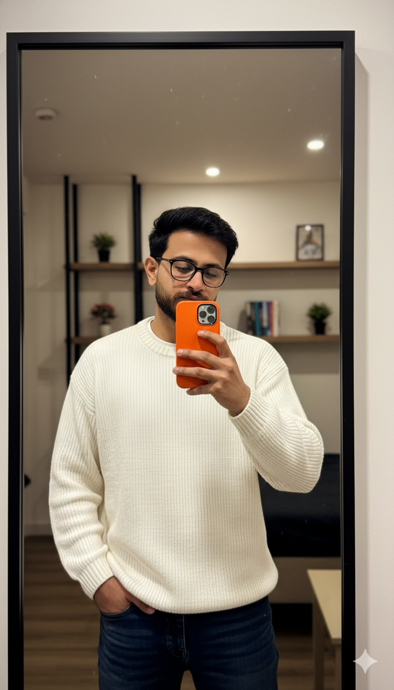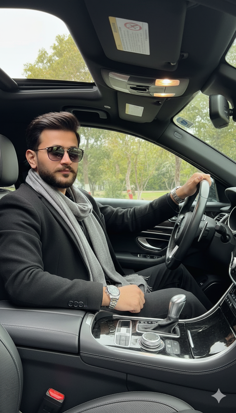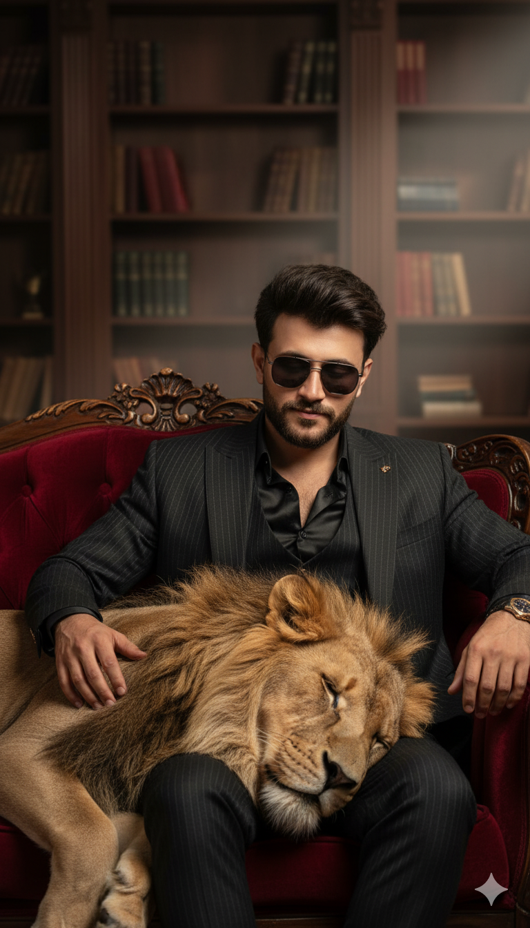 Studio photography of a me in a black suit, black turtleneck and round sunglasses with translucent yellow lenses.