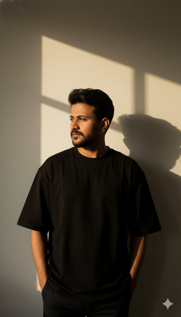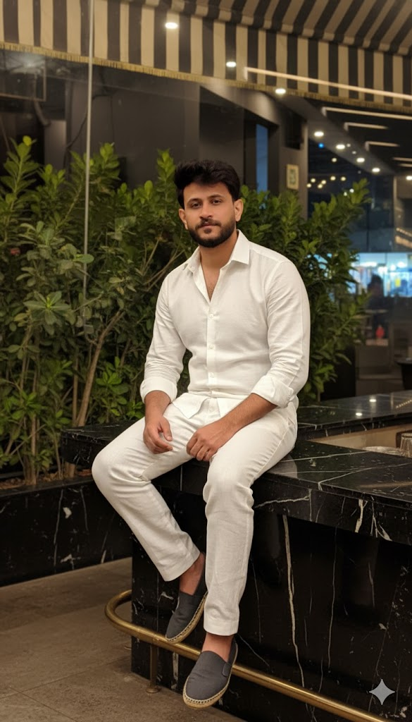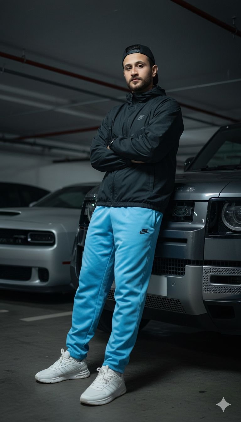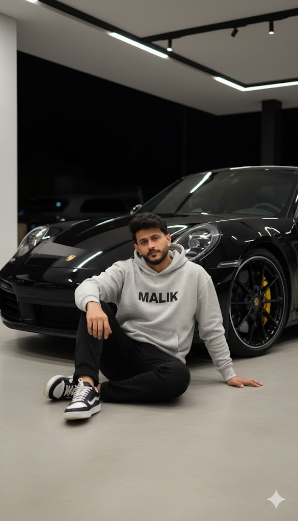 Hyper realistic cinematic full body portrait of the same young man (face unchanged) sitting casually on a shiny black Pakistani …