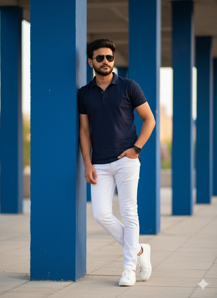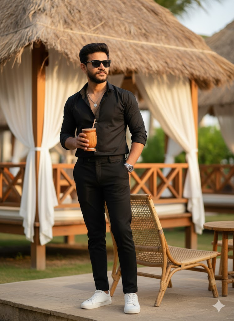 4K ultra realistic DSLR photograph of a stylish young man standing confidently in an outdoor luxury resort setting. He is …