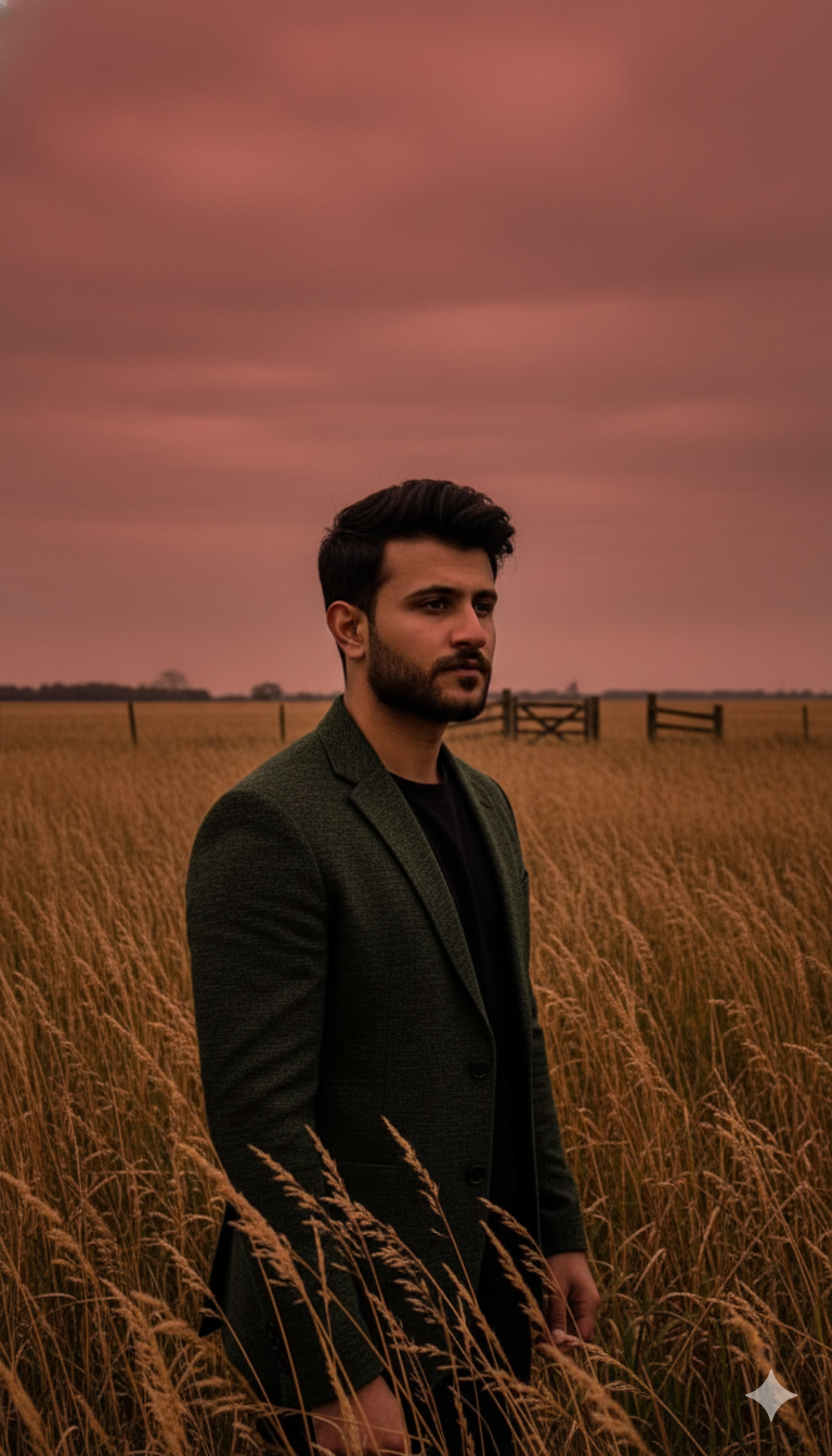 Ultra-realistic 8k cinematic fashion editorial portrait, ratio 9:16, captured with CanonEOS R5 and f/1.2 lens. A young man (from uploaded …
