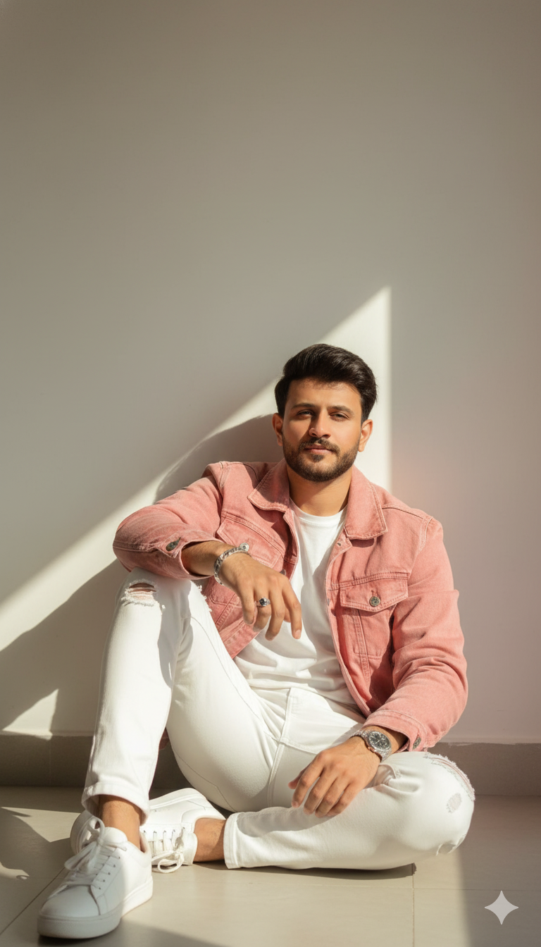 Ultra-realistic full-body portrait of a stylish young man sitting casually on the floor indoors, leaning back against a plain off-white …