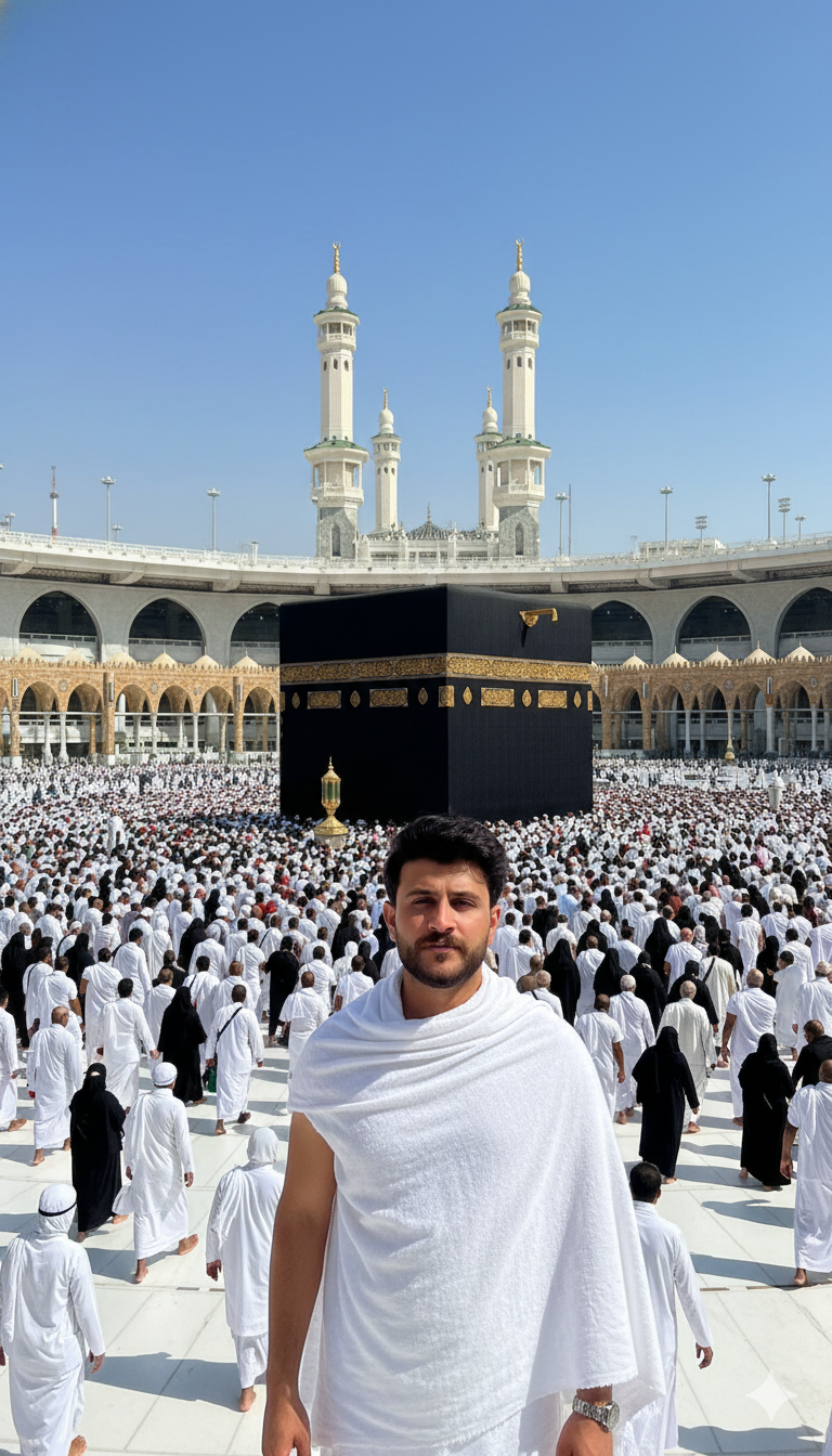 A man (Use face from uploaded pic)standing in front of the Holy Kaaba in Mecca, wearing white Ihram clothing, surrounded …