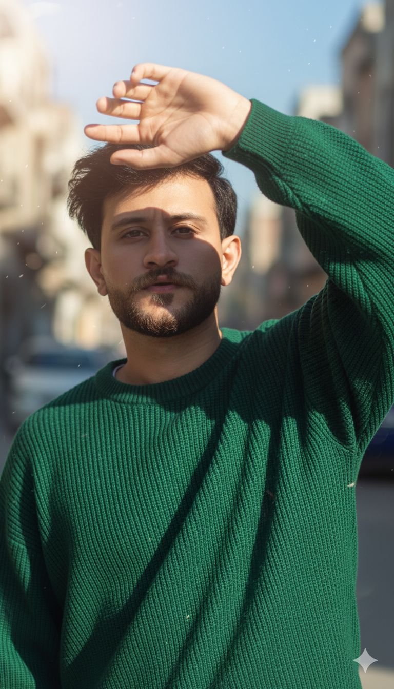 Edit the attached image and do not alter the features. A young man, of Middle Eastern appearance, stands slightly left …