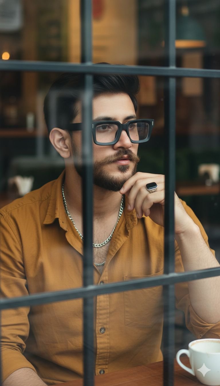 full-body hd portrait. face 100% same as reference. young stylish man, dark voluminous hair, well-groomed beard, black aviators. wearing dark …