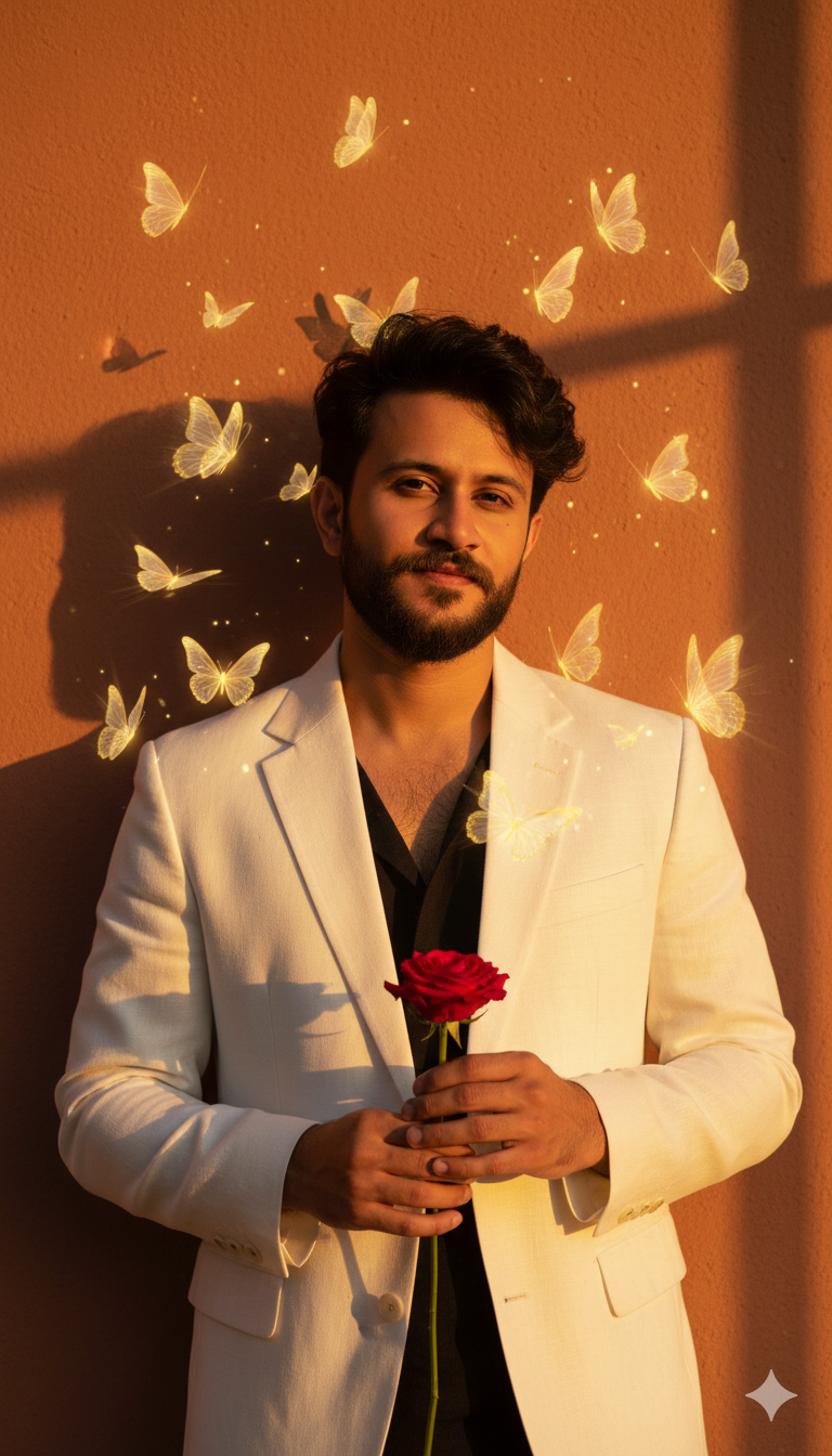 Ultra-photorealistic 8K sunset portrait, handsome man with exact face and hairstyle in luxury white blazer standing against warm terracotta wall …