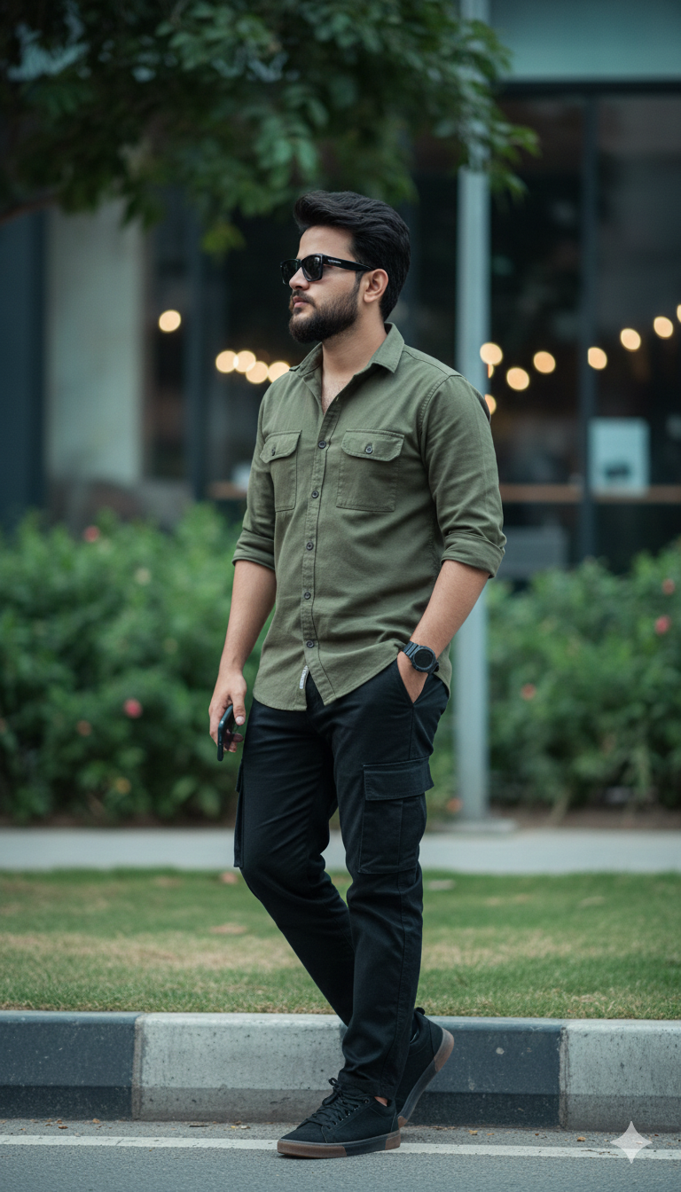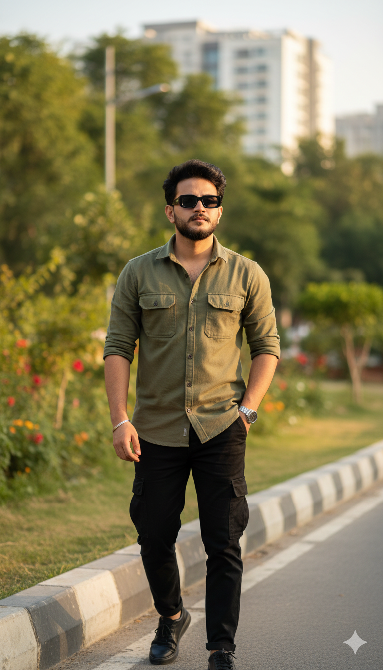 Ultra-realistic 4K portrait of a young Indian couple, both faces 100% same as reference. The boy wears an olive-green overshirt …
