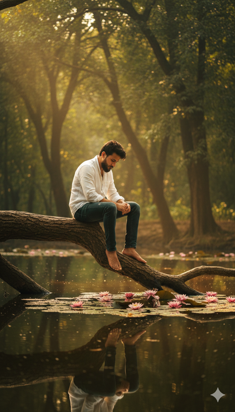 Generate a portrait of a man sitting barefoot on a thick tree branch that extends over a calm lake. He …