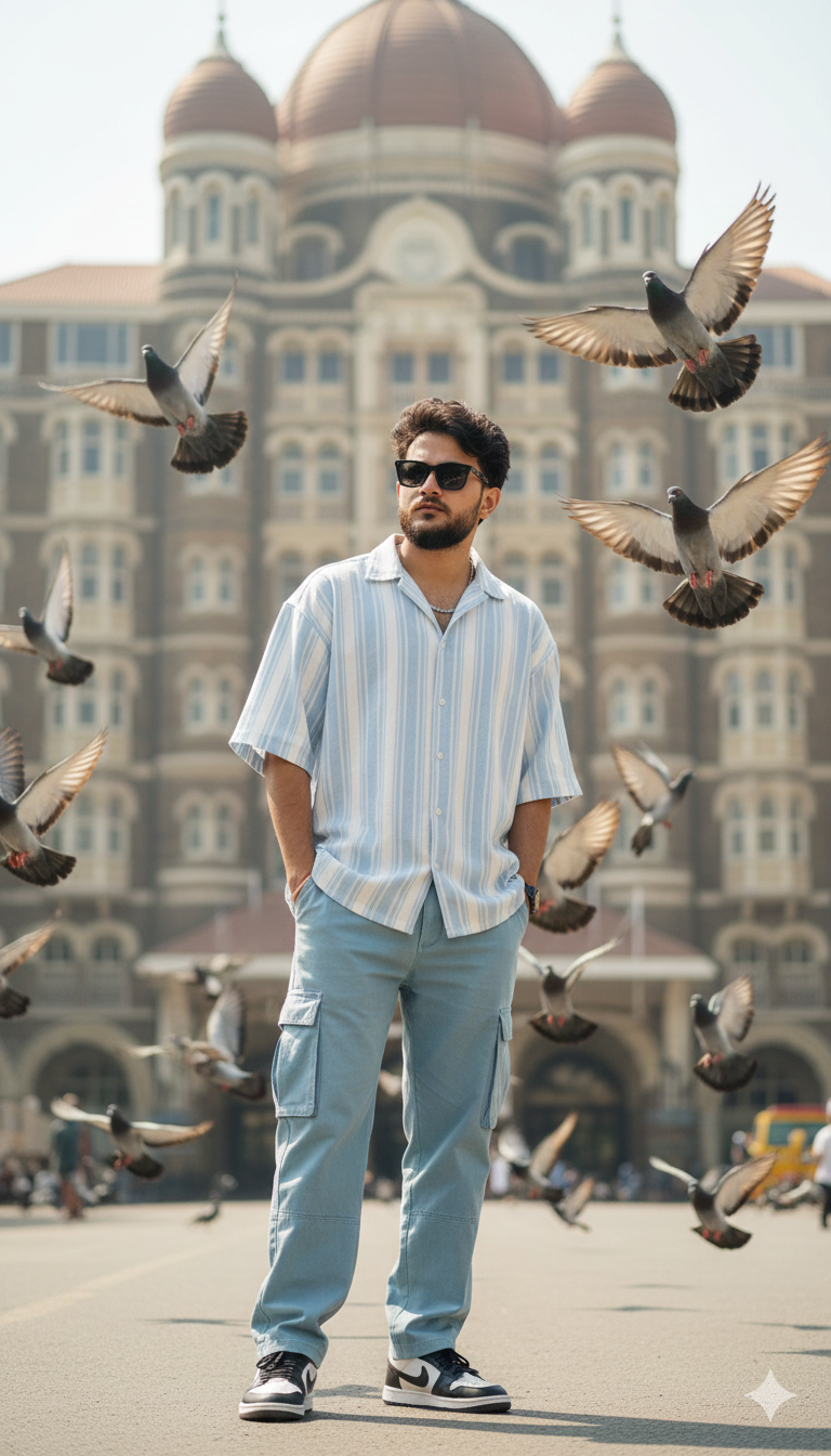 Full-body ultra-realistic portrait of the same young man use reference face and hairstyle) standing. casually near the iconic backside of …