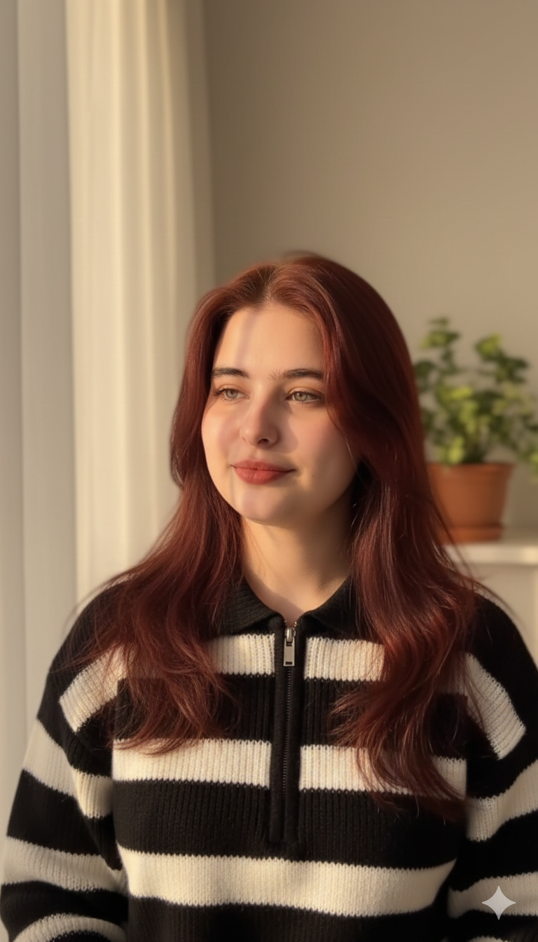 Create a cinematic portrait of her sitting in a cozy café with amber lamplight, cinnamon tones, and textured shadows. The …