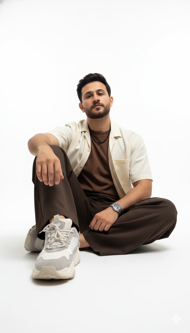 Prompt Modify the attached image of a man sitting on a bright white surface, angled