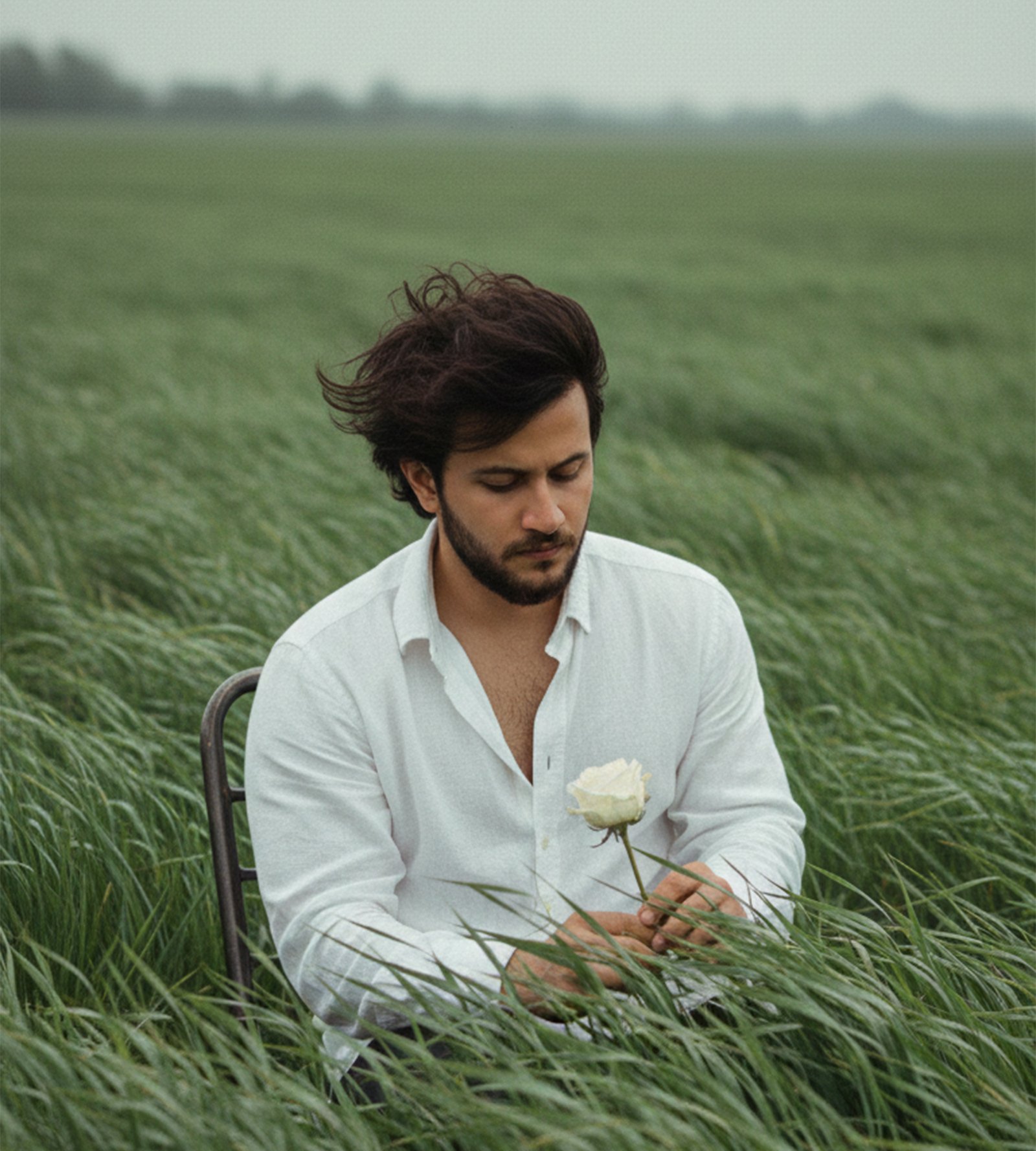 Cinematic editorial portrait of a man sitting on a simple chair in vast wind-swept green grass fields, tall grass flowing like ocean waves partially obscuring him, wearing a loose white shirt and holding a single white rose, messy dark hair blowing in the wind, head tilted down, calm melancholic mood, vertical 9:16, telephoto style, shallow depth of field, film grain, atmospheric poetic look, no text, award-winning quality, face exactly matching the attached photo.